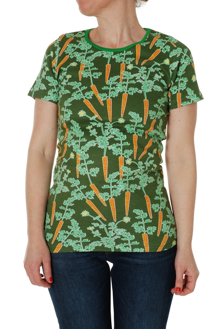 Gorgeous 100% organic cotton adult short sleeved top in beautiful carrots print with green trim.
