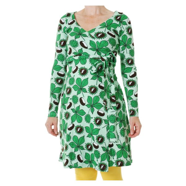 Gorgeous 100% organic cotton long sleeved adult wrap dress in beautiful conkers print on brook green background.