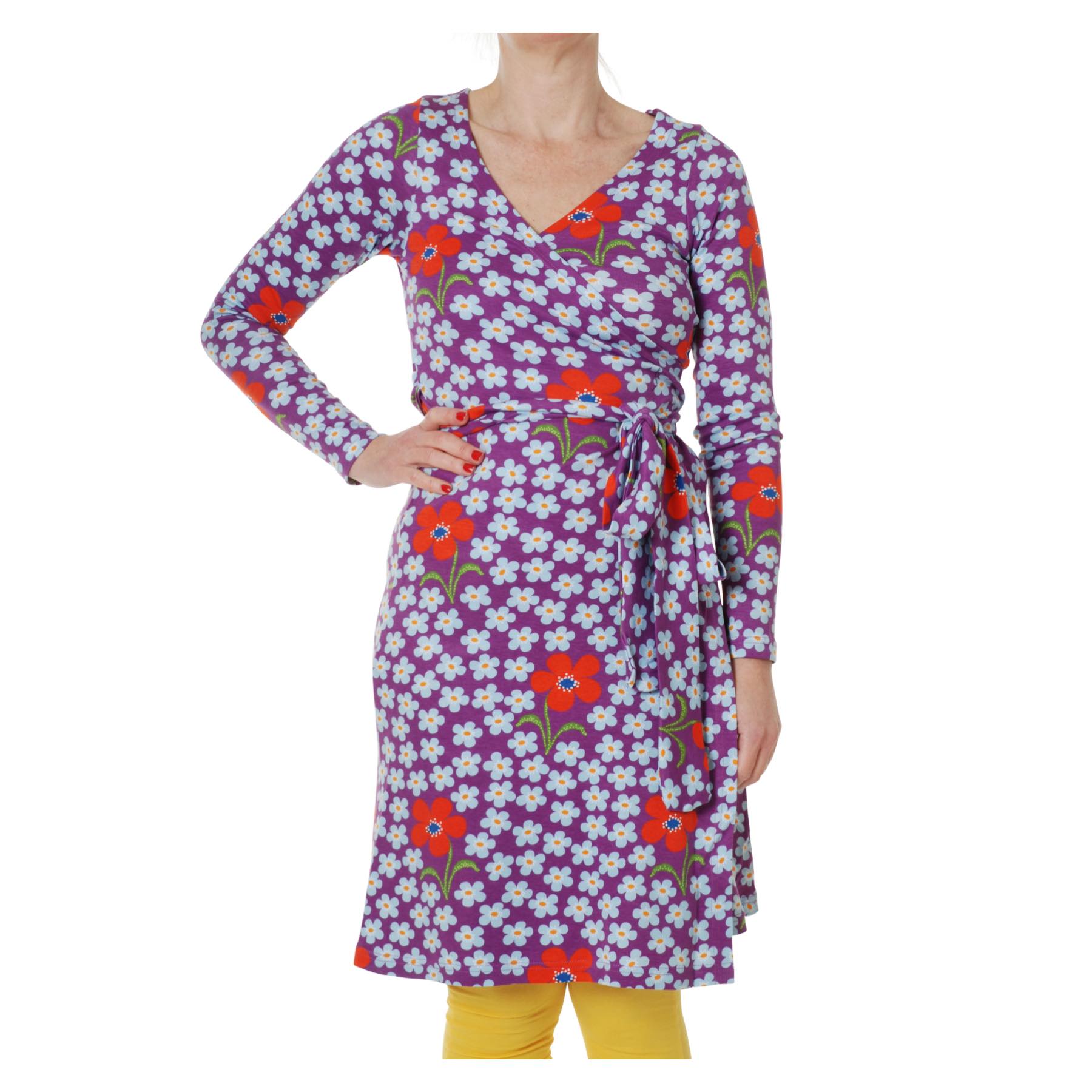 Gorgeous 100% organic cotton long sleeved adult wrap dress in beautiful flower print on amethyst background.