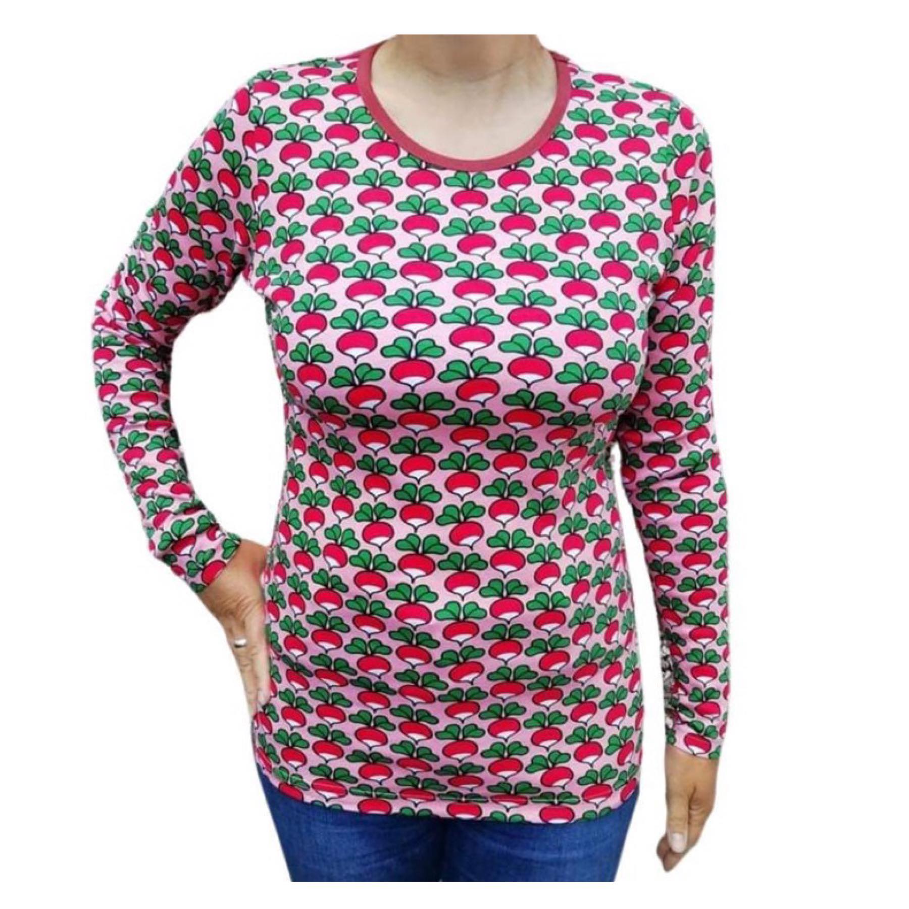 Gorgeous 100% organic cotton adult long sleeved top in Duns iconic radish print on peach background with brick red trim.