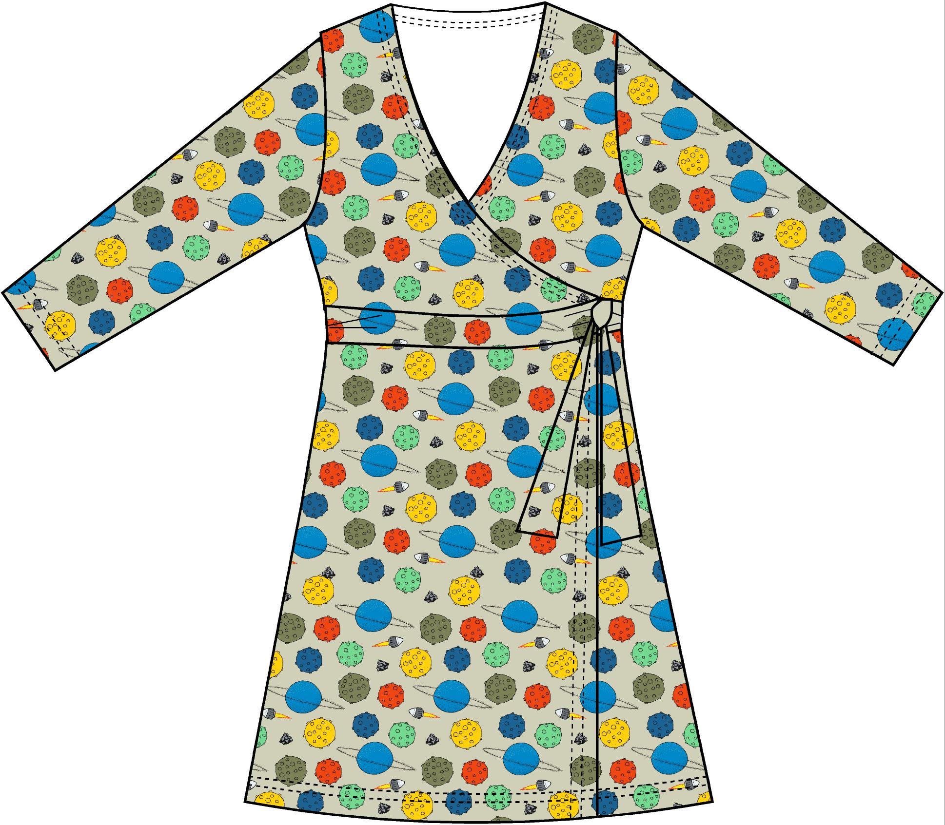Gorgeous 100% organic cotton long sleeved adult wrap dress in beautiful small planets print on putty background.