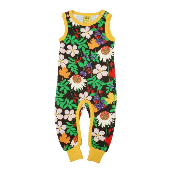 Gorgeous 100% organic cotton dungarees in beautiful autumn flowers print on brown background with yellow cuffs and trim.