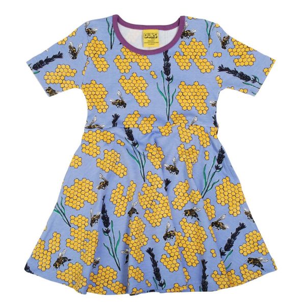 Gorgeous organic cotton short sleeved skater dress with pockets in beautiful bee print featuring bees, honeycomb and sprigs of lavender on grape background with purple trim.