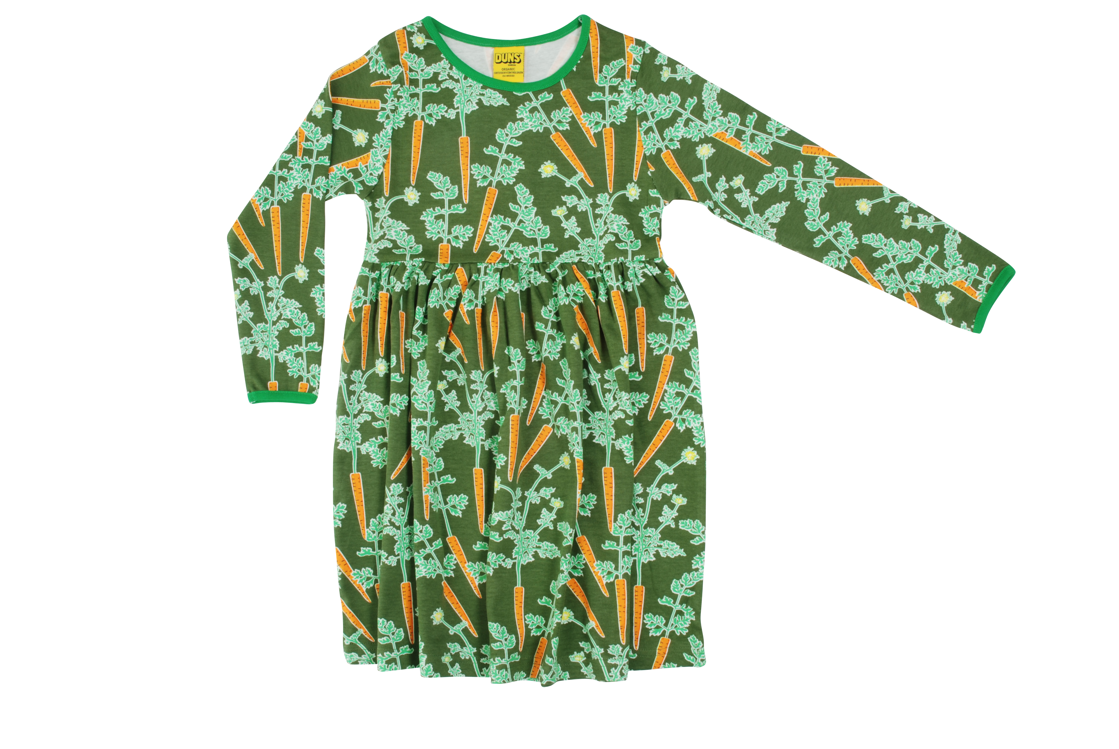 Gorgeous organic cotton long sleeved dress with twirly skirt in beautiful carrots print on dark green background with green trim.