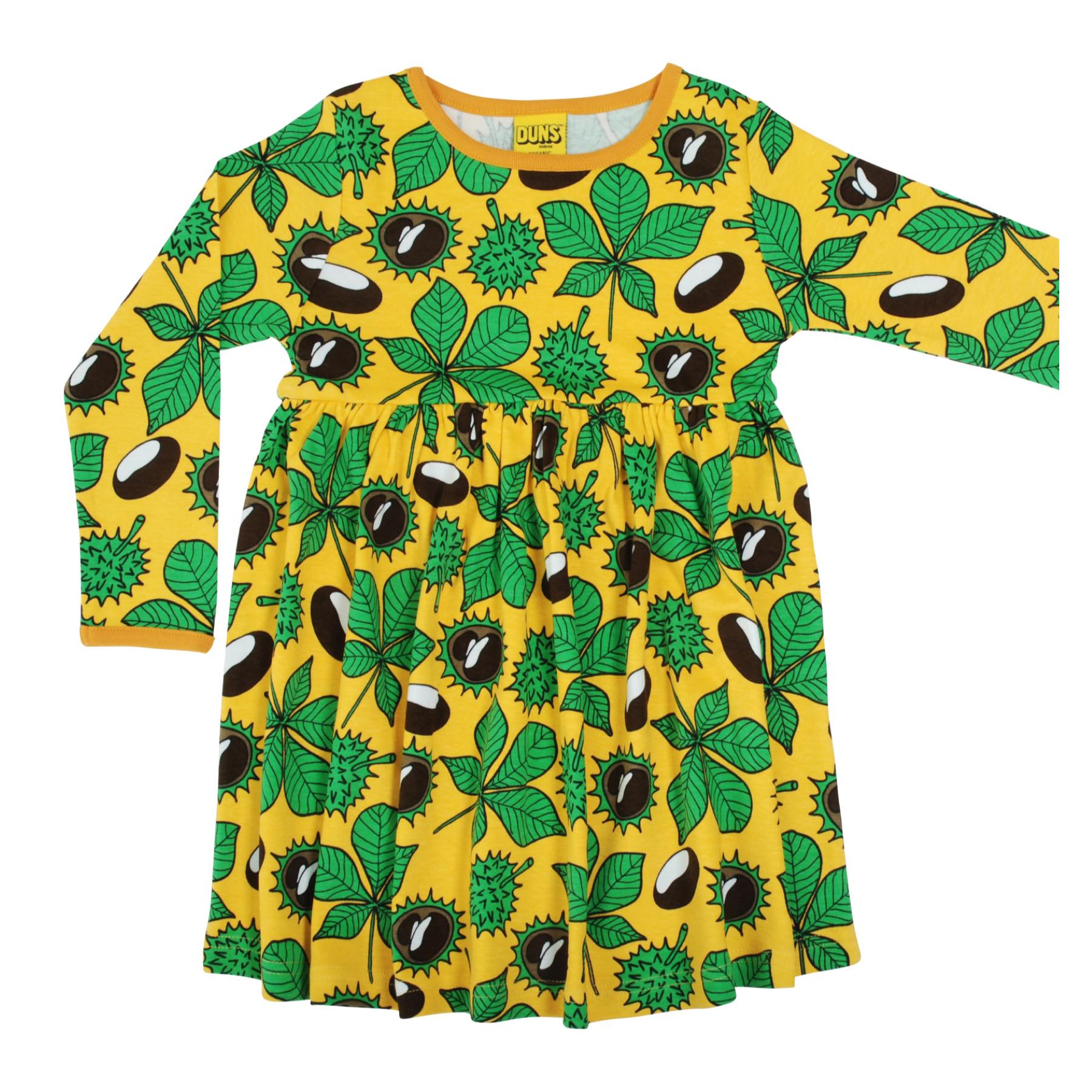 Gorgeous organic cotton long sleeved dress with twirly skirt in beautiful conkers print on daffodil yellow background with sunflower trim.