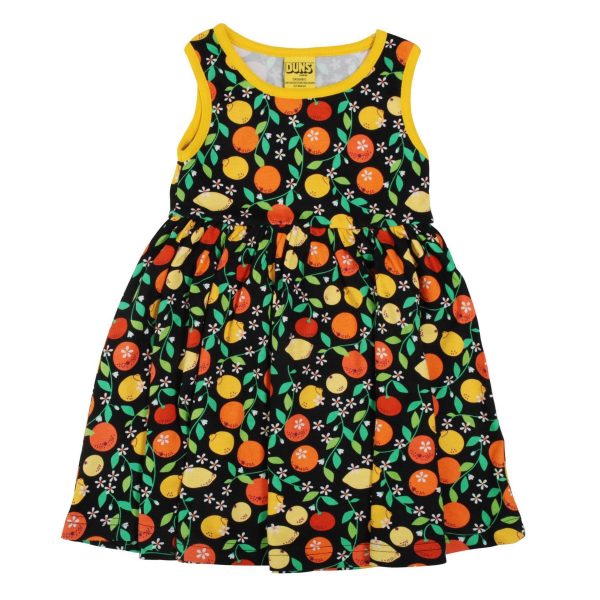 Gorgeous organic cotton sleeveless dress with twirly skirt in fabulous citrus print featuring oranges, lemons, blossom and leaves on black background with yellow trim.