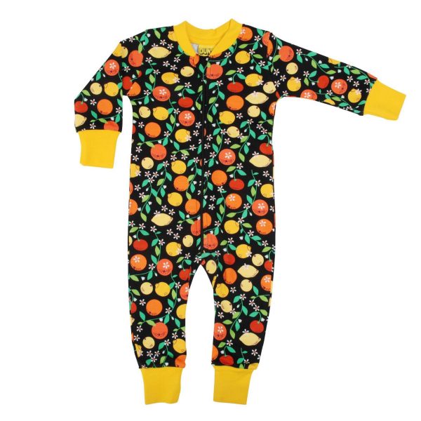 Gorgeous 100% organic cotton zip suit in fabulous citrus print featuring oranges, lemons, blossom and leaves on black background with yellow trim and cuffs.