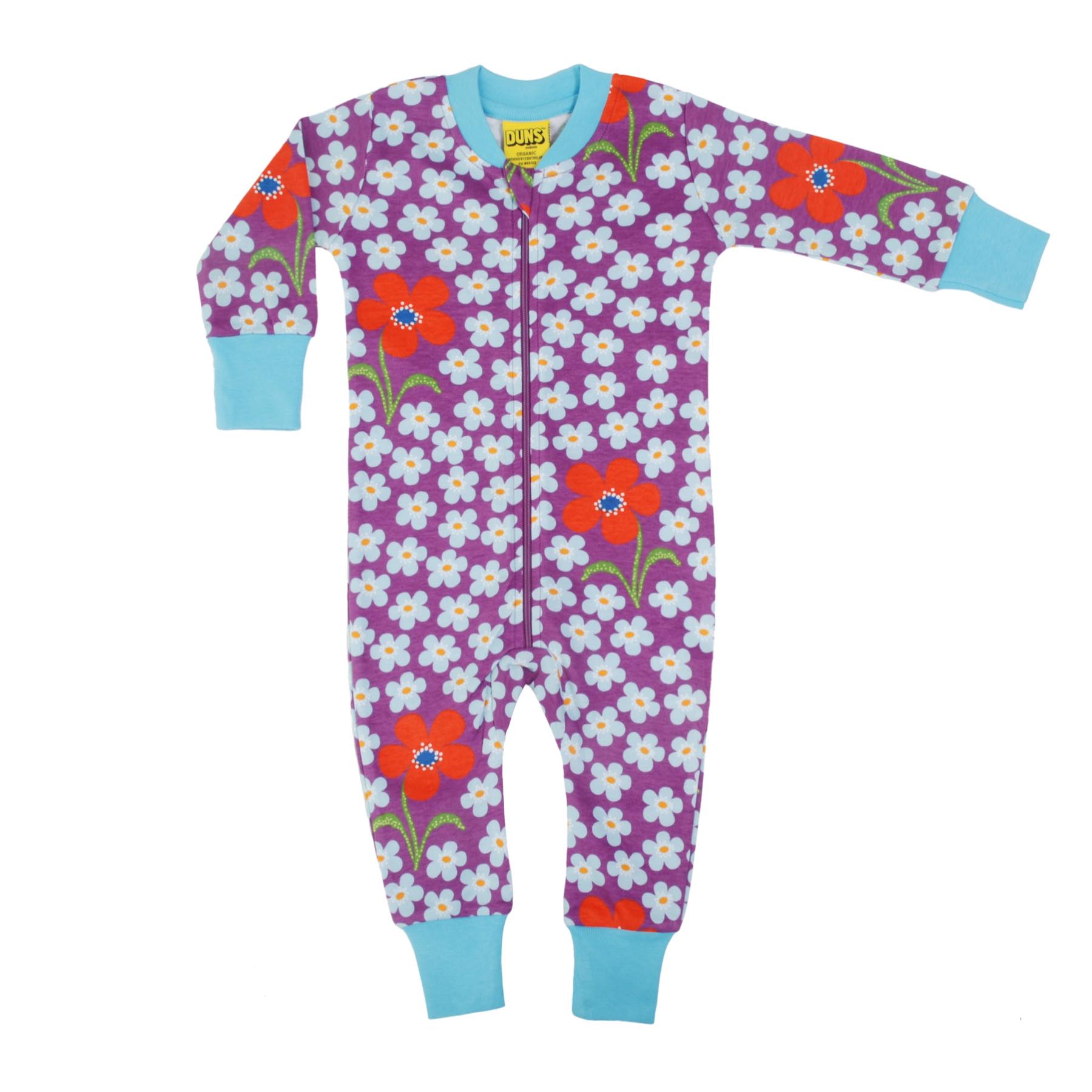 Gorgeous 100% organic cotton zip suit in beautiful flower print on amethyst background with sky blue cuffs and trim.