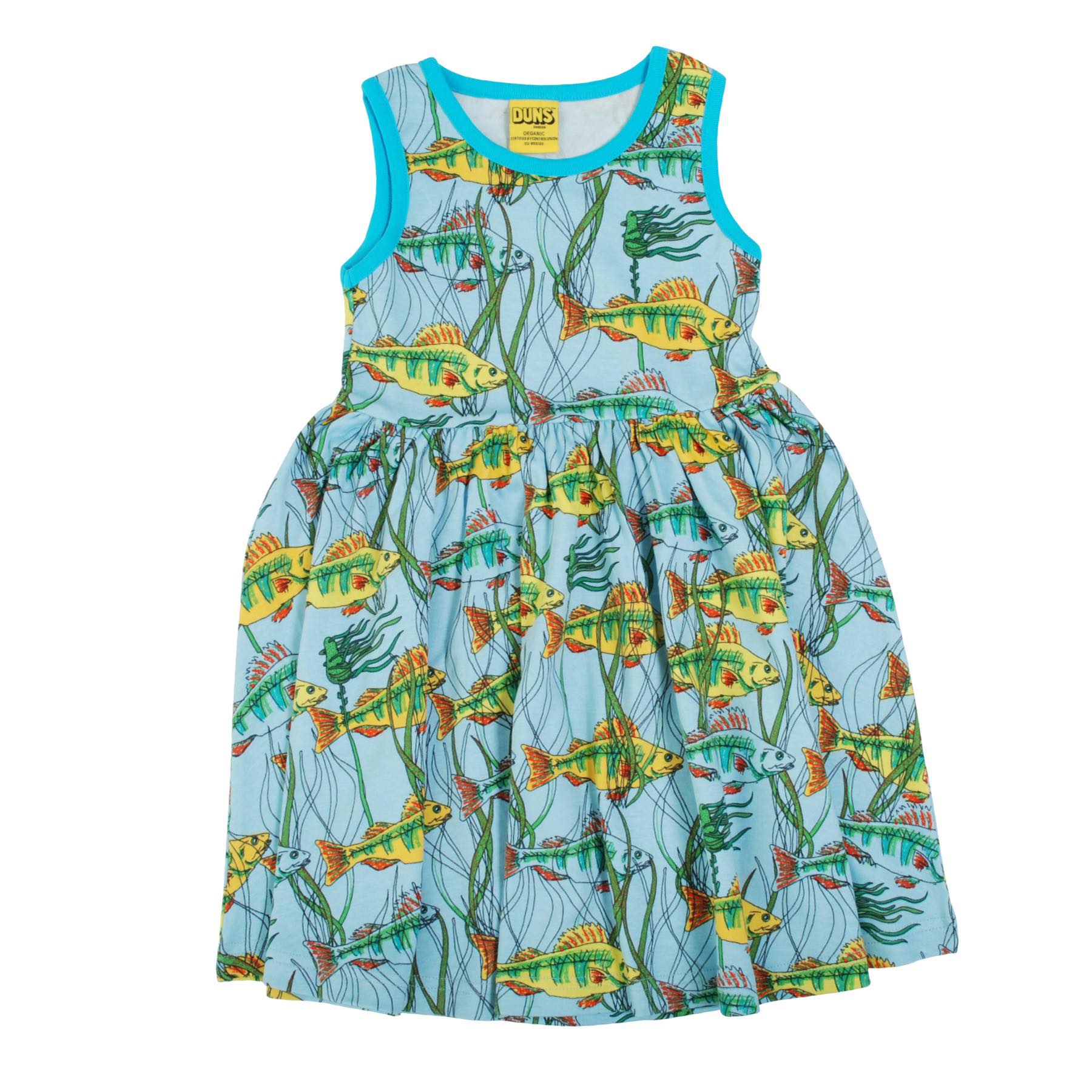 Gorgeous organic cotton sleeveless dress with twirly skirt in fab fish print on pale blue background and blue trim.