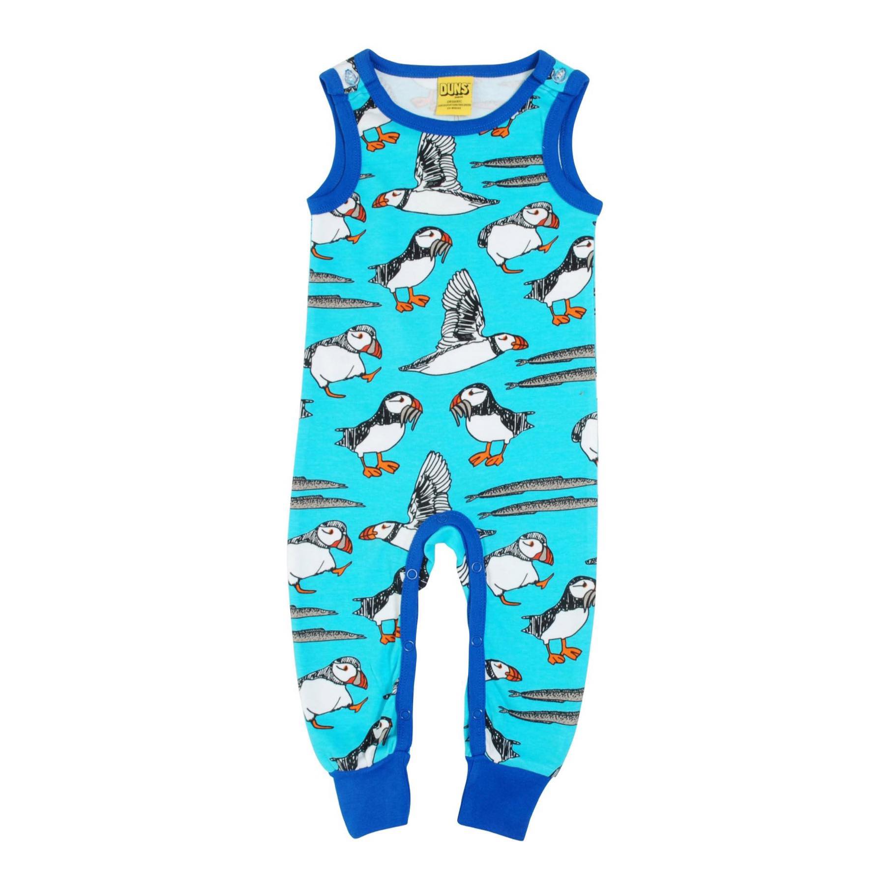 Gorgeous 100% organic cotton dungarees in fab puffin print on blue atoll background with blue cuffs and trim.