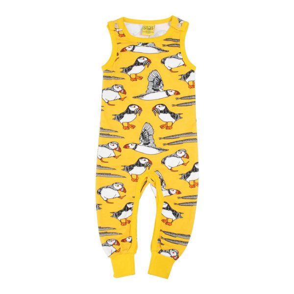 Gorgeous 100% organic cotton dungarees in fab puffin print on lemon chrome yellow background with lemon chrome cuffs and trim.