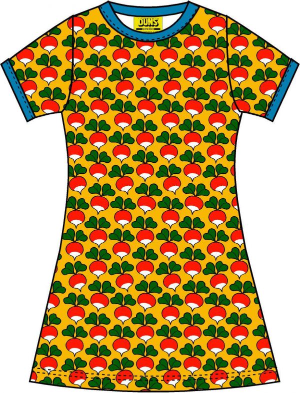 Gorgeous organic cotton short sleeved dress in Duns iconic radish print on mustard background.