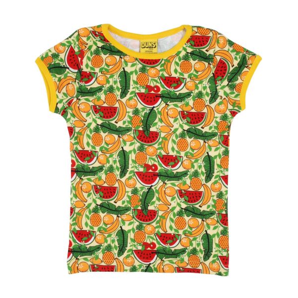 Gorgeous 100% organic cotton short sleeved top in beautiful tropical fruits print with yellow trim.
