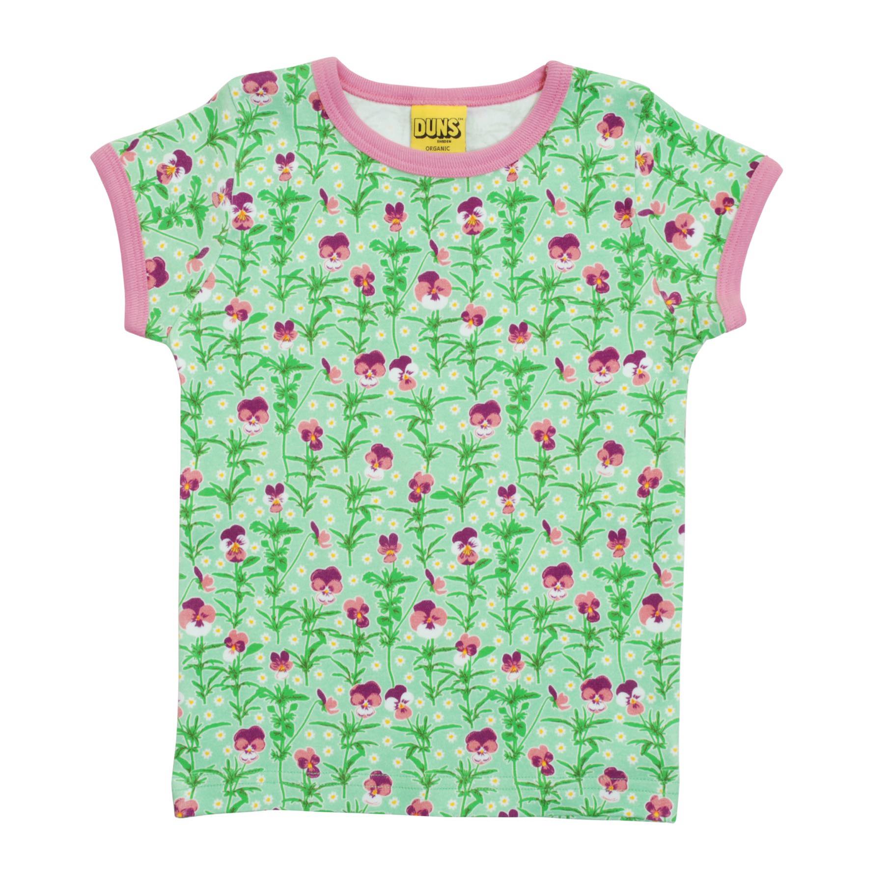 Gorgeous 100% organic cotton short sleeved top in beautiful wild pansy print on pale green background with fuchsia trim.