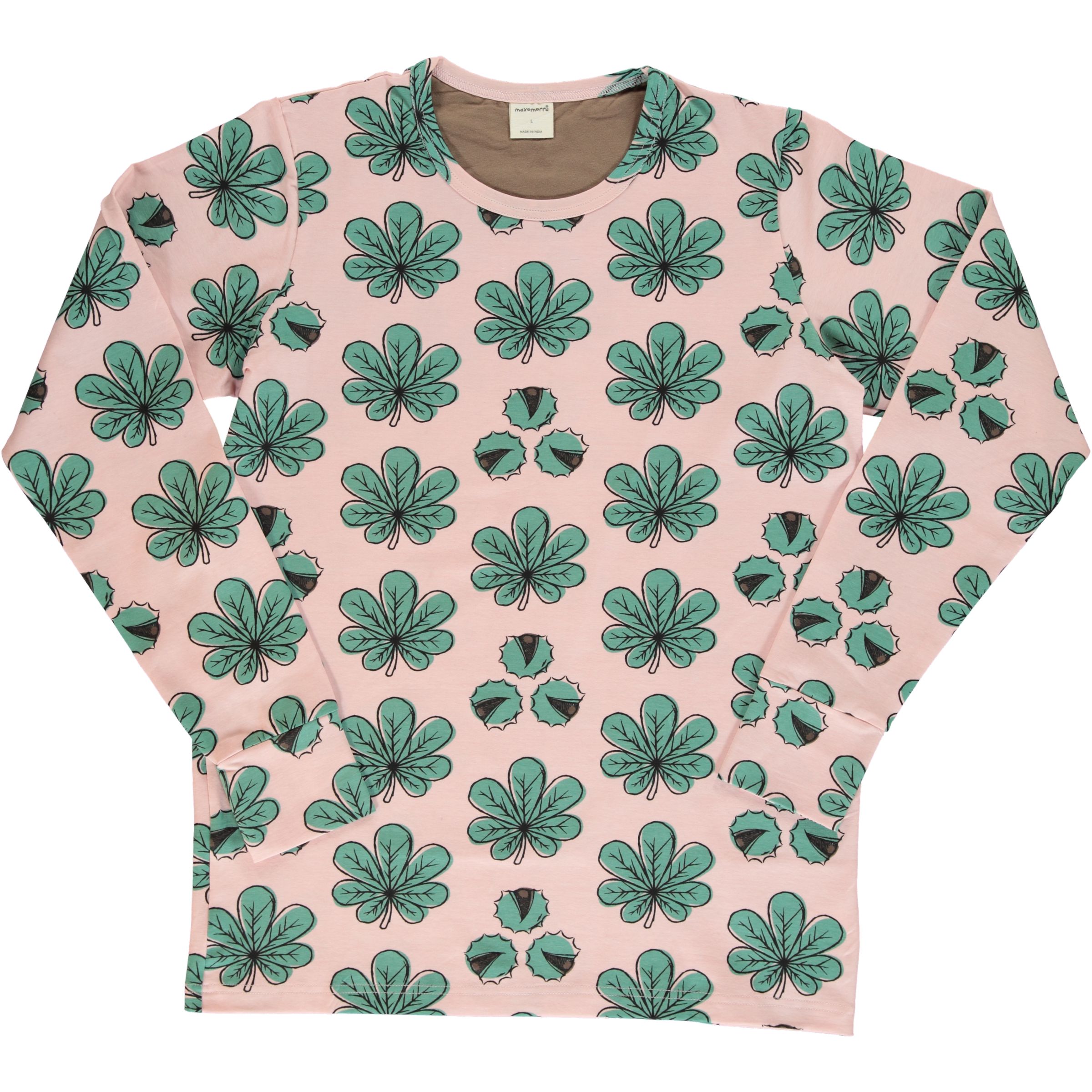 Gorgeous organic cotton adult long sleeved top in chestnut leaf print.
