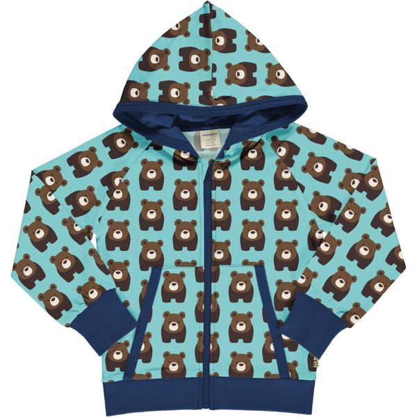 Fabulous bear print hoodie with zip in soft organic sweatshirt single layer fabric with plain navy lining in hood.