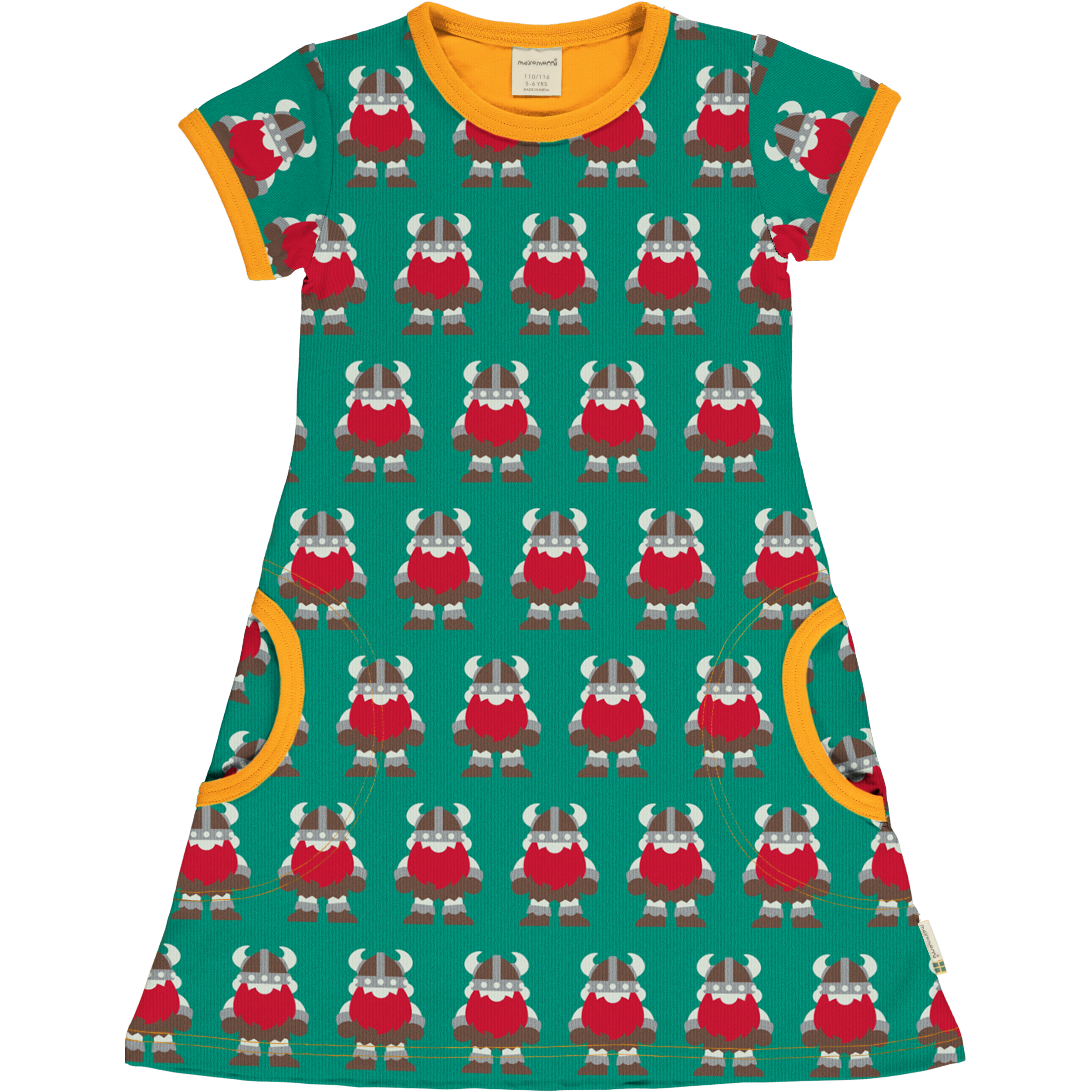 Gorgeous short sleeved dress in soft organic cotton jersey in viking print with tangerine trim.