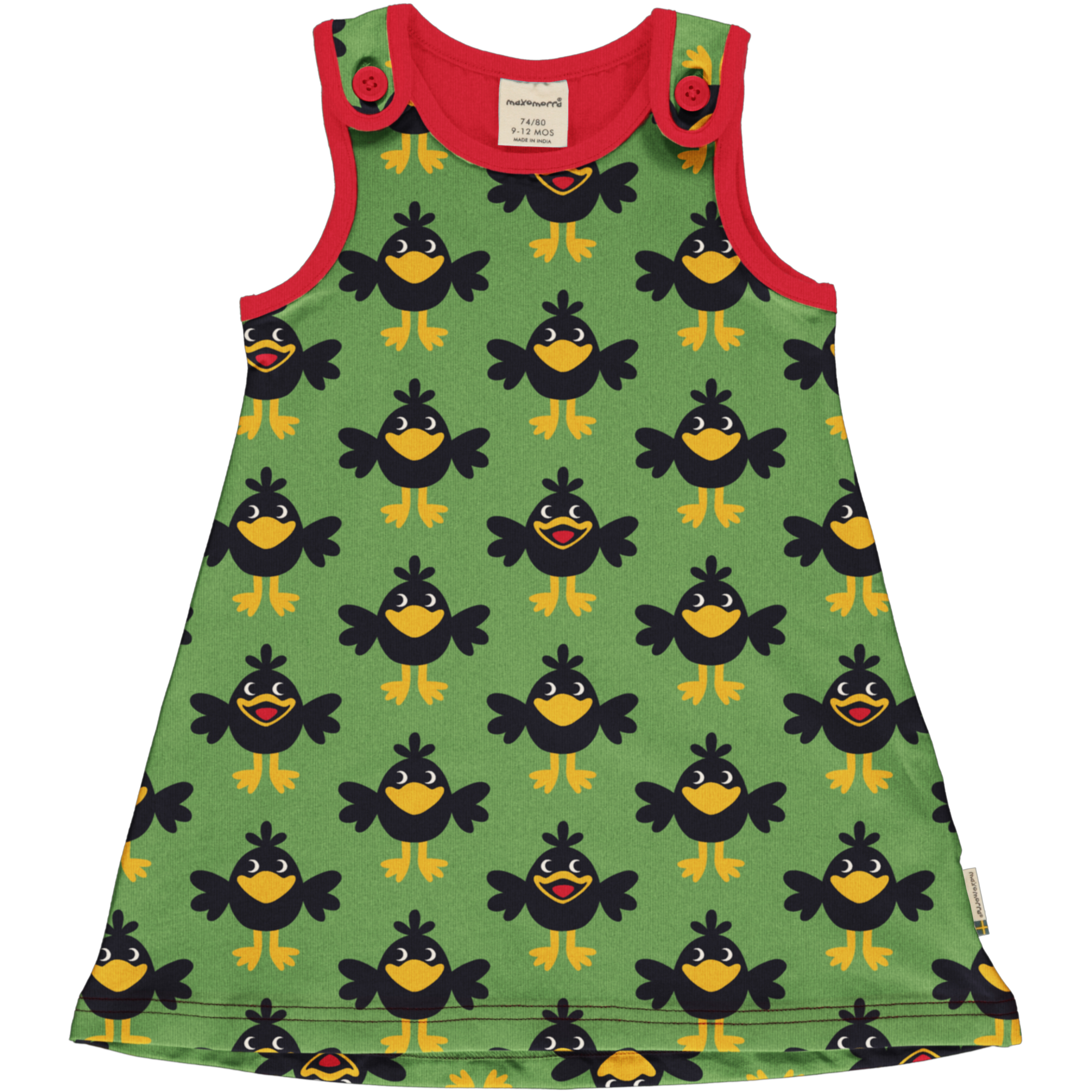Fab crow print sleeveless dress in soft organic cotton jersey with narrow neck binding and rounded shoulder straps with sew-through button and buttonhole closure.