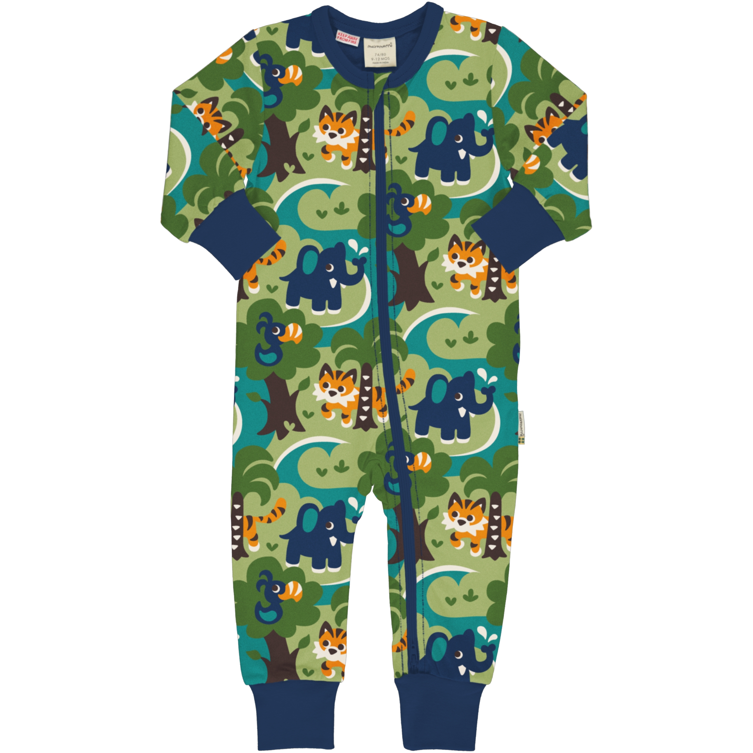 Fabulous long sleeved romper in beautiful jungle print with contrasting navy cuffs and trim.