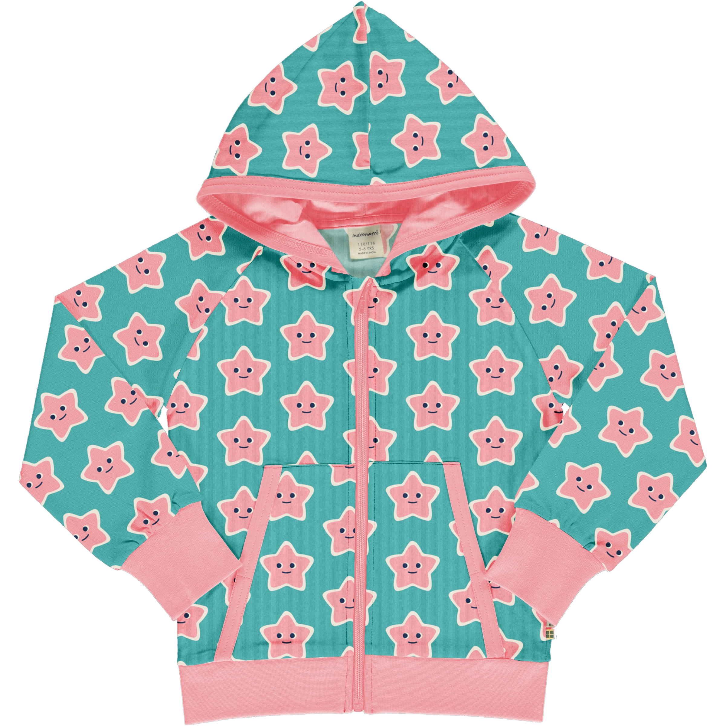 Fabulous starfish print hoodie with zip in soft organic sweatshirt single layer fabric with plain pink lining in hood. Hoodie has 2 front pockets and plain pink cuffs, waistband and trim.