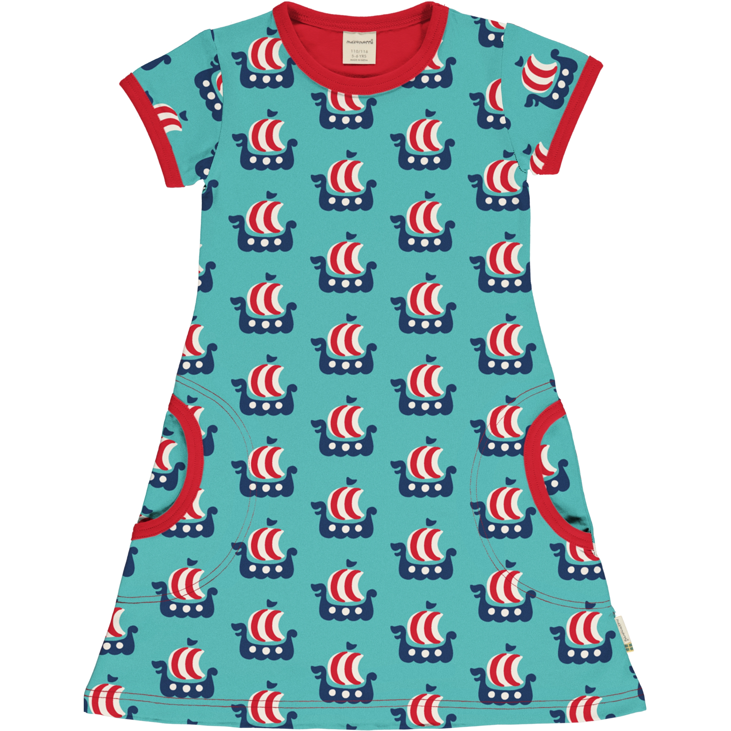 Gorgeous short sleeved dress in soft organic cotton jersey with fab viking ship print and contrasting red trim.