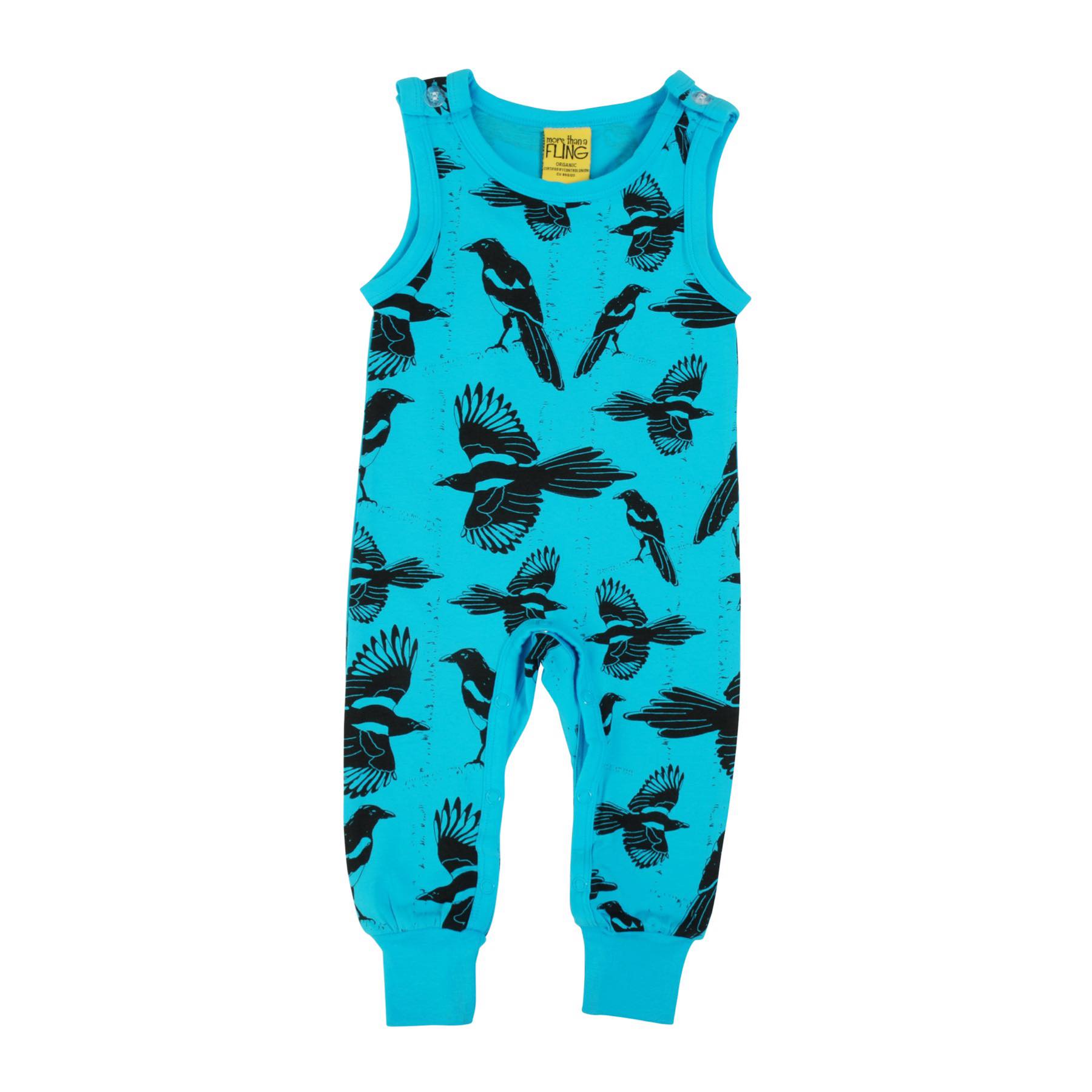 Gorgeous organic cotton dungarees in fabulous magpie print on blue atoll background, cuffs and trim.