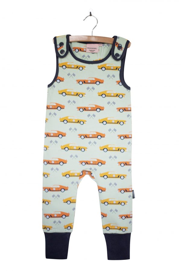 Fabulous organic cotton dungarees in cool retro car print with contrasting cuffs and trim.
