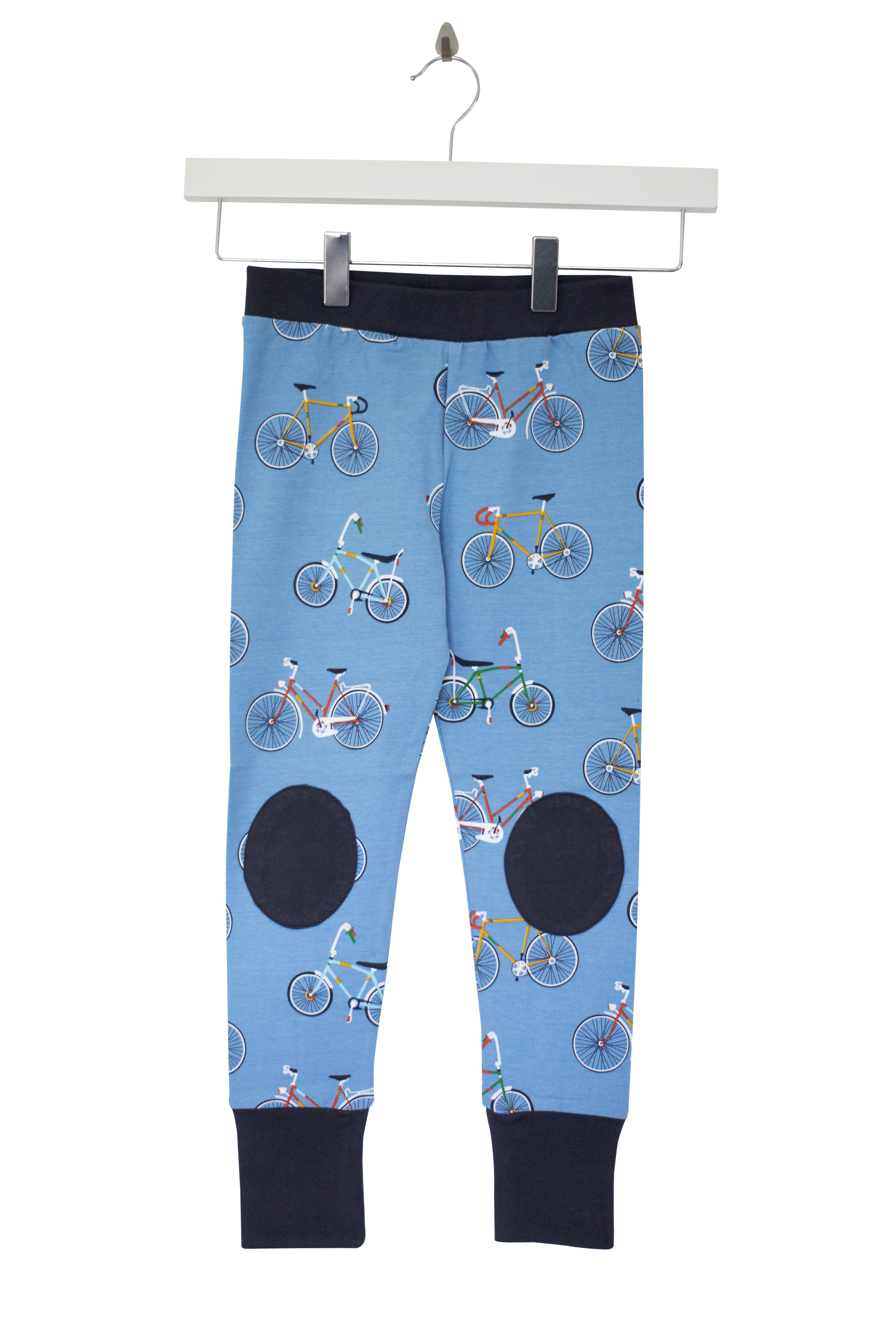 Fabulous organic cotton leggings in cool bike with contrasting cuffs, waistband and knee patches.