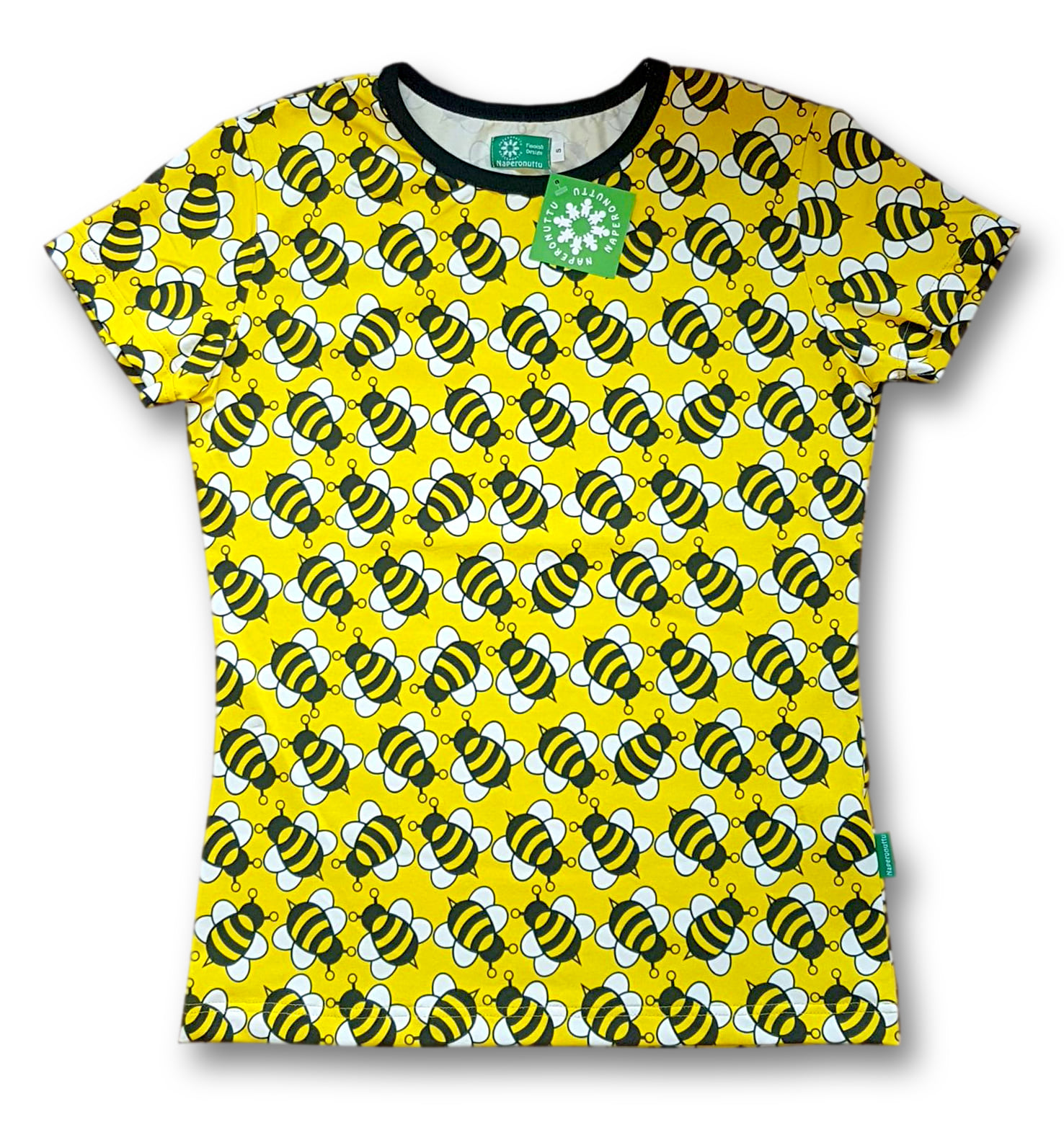 Fabulous organic jersey cotton short sleeved women’s top with amazing bee print on yellow background and black trim.