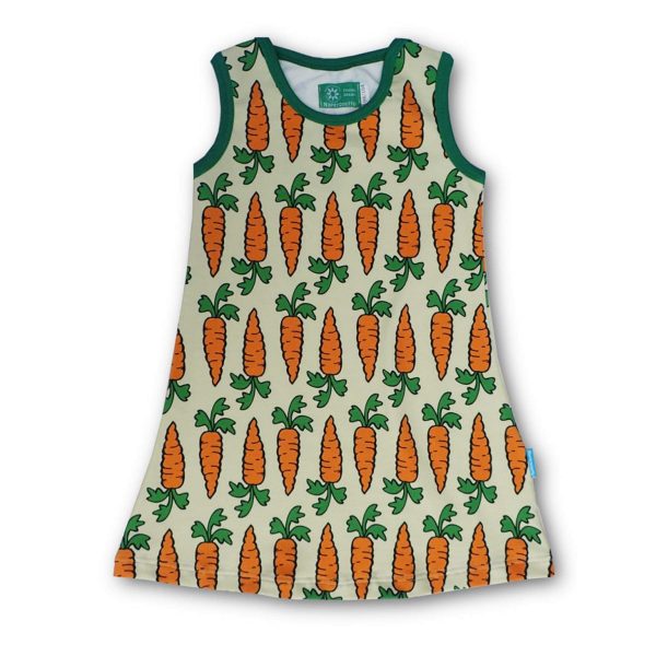 Super soft stretch college organic cotton sleeveless dress in wonderful carrot print with green trim.