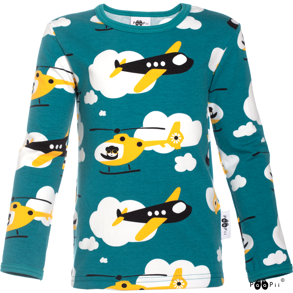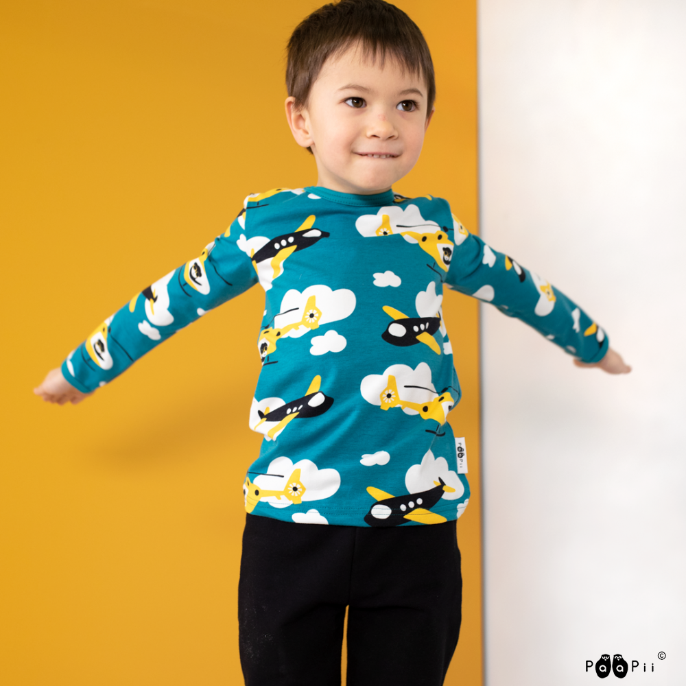 Long sleeved top in beautifully soft and flexible organic cotton jersey with fabulous aircraft print on petrol background.