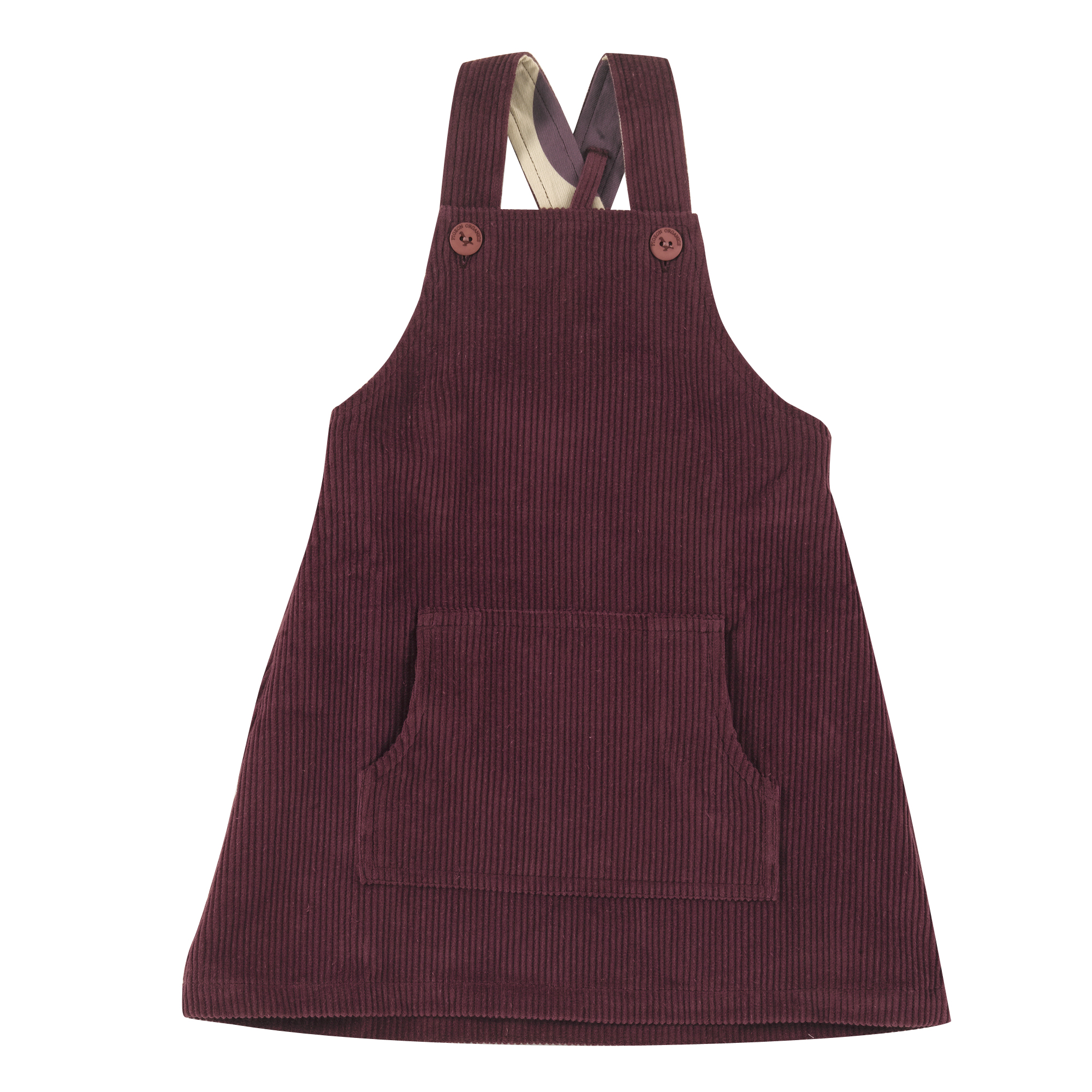 Gorgeous chunky cord pinafore dress in fig with front pocket and button fastening.
