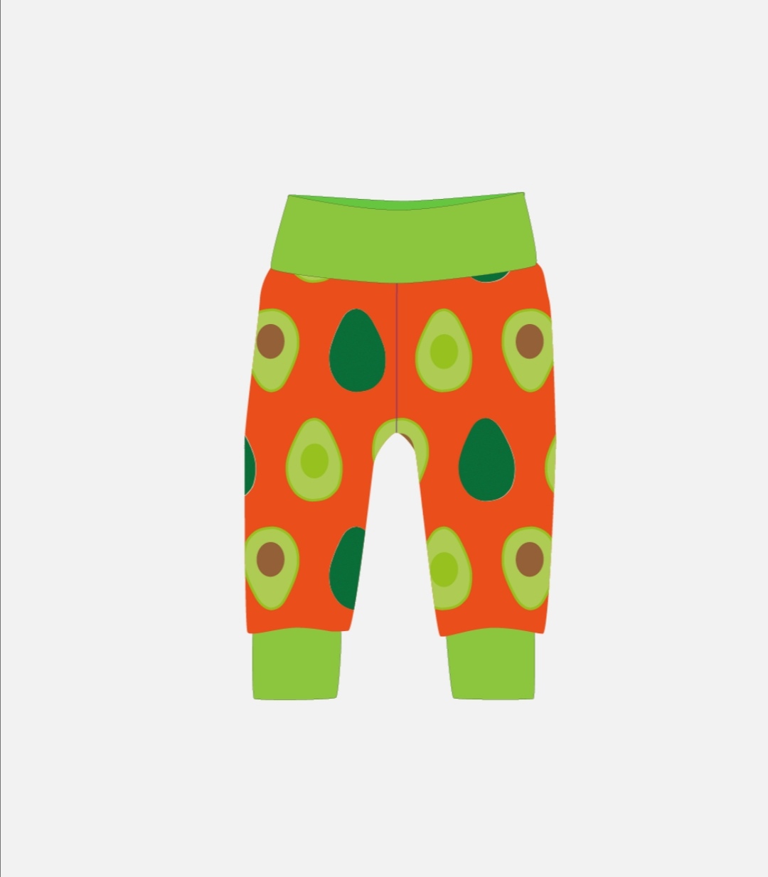 Gorgeous organic cotton trousers in avocado print with green waistband and cuffs.