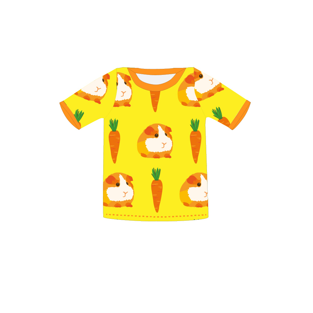 Gorgeous organic cotton relaxed fit short sleeved t-shirt in guinea pig and carrot print on yellow background with orange trim.