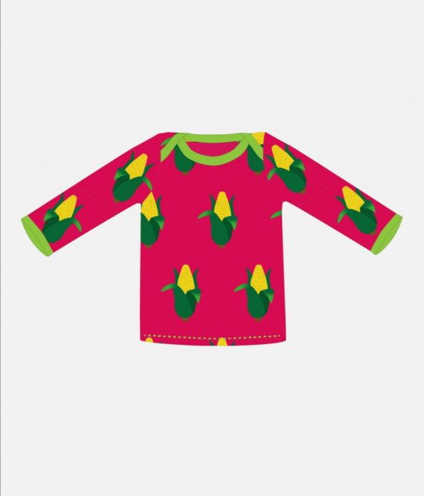 Gorgeous organic cotton long sleeved t-shirt in sweetcorn print with green trim.