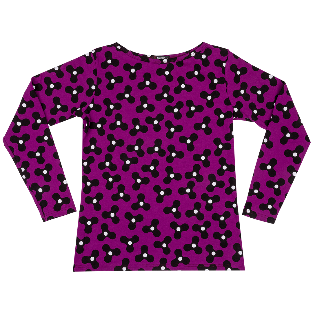 Gorgeous organic cotton Mama long sleeved top in spinning windmills print on purple background.