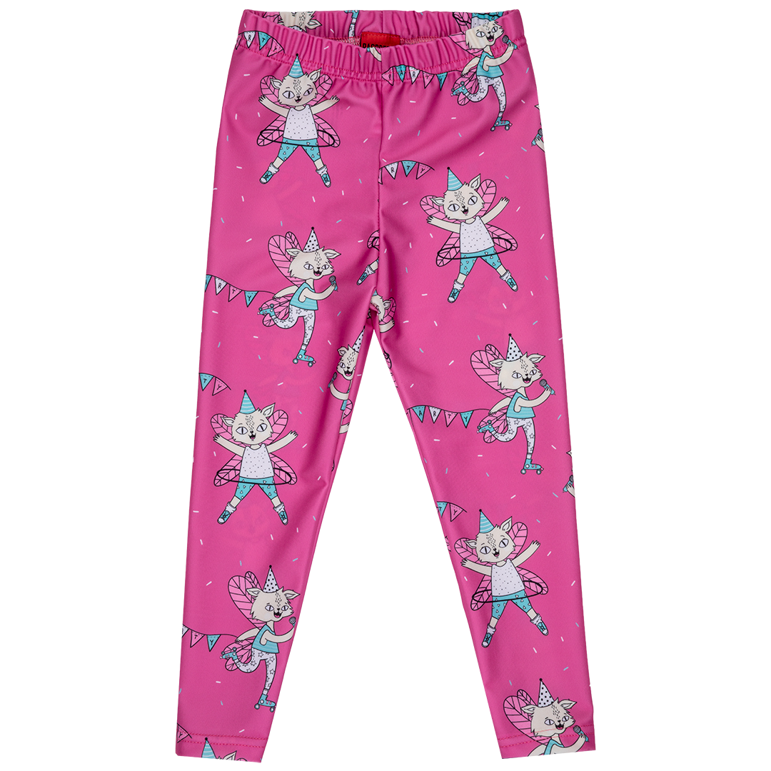 Fabulously bright jogging tights in flying kitty print made from recycled polyester and elastane.