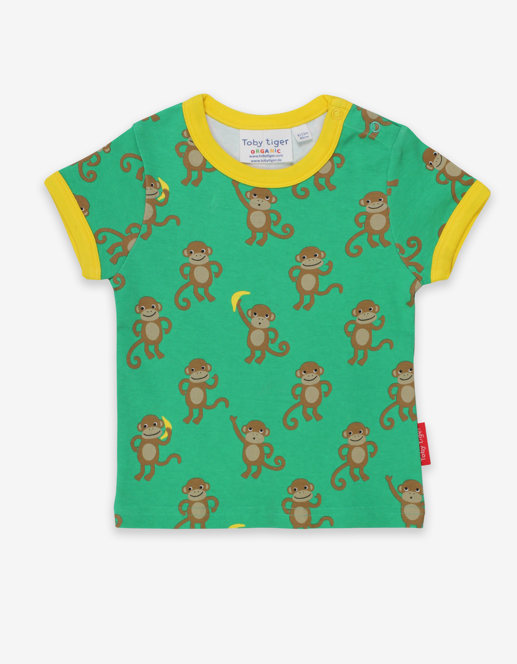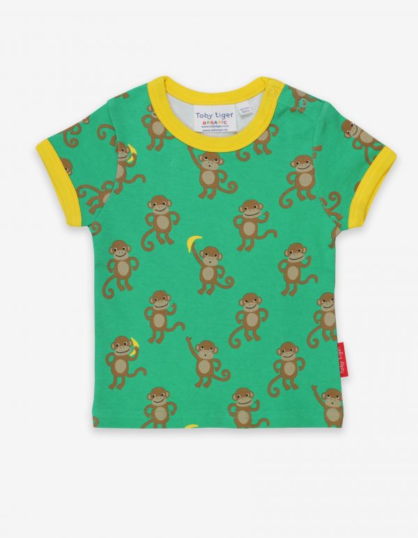 Gorgeous organic cotton t-shirt in fabulous monkey print on green background with yellow trim on neckline and cuffs.