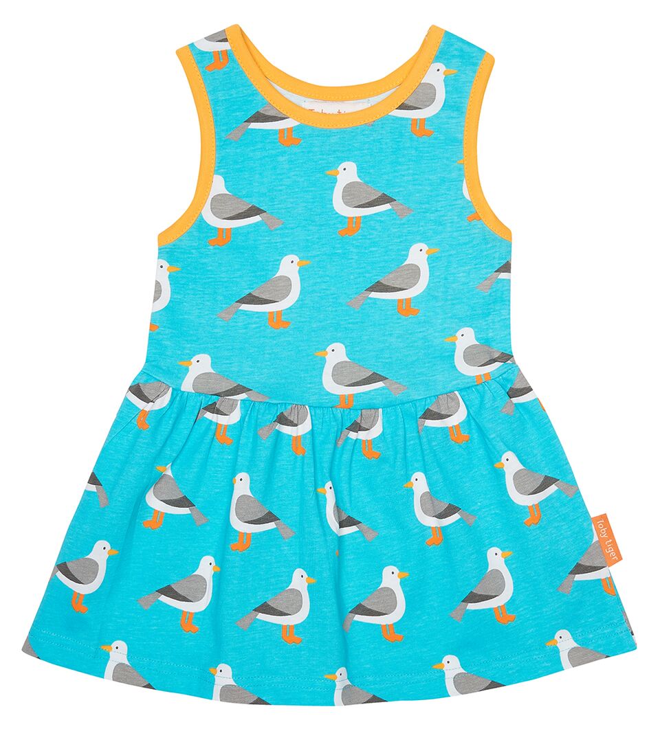 Fabulous sleeveless twirly dress with all over seagull print and contrasting yellow trim.
