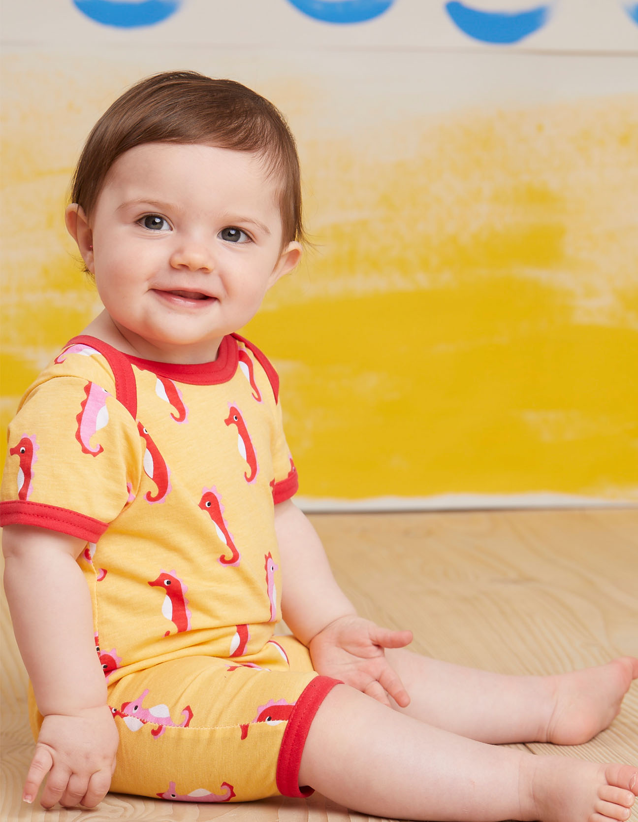 Gorgeously soft organic cotton short romper in beautiful seahorse print on pale yellow background and red trim.