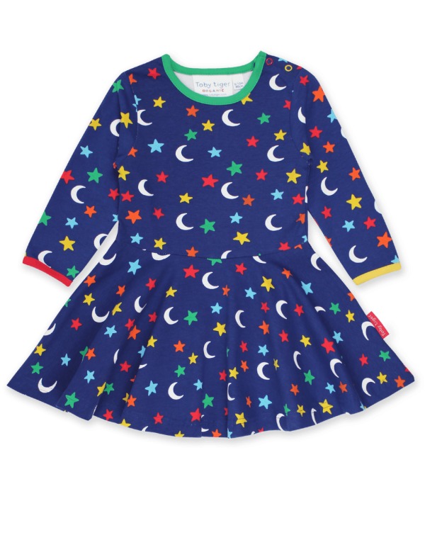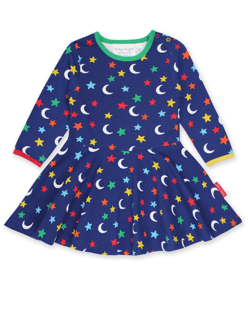 Swirl and twirl in this fab and floaty moon and star print organic T-shirt dress. Made from super soft 100% certified organic cotton featuring long sleeves, it’ll keep little ones warm all winter.