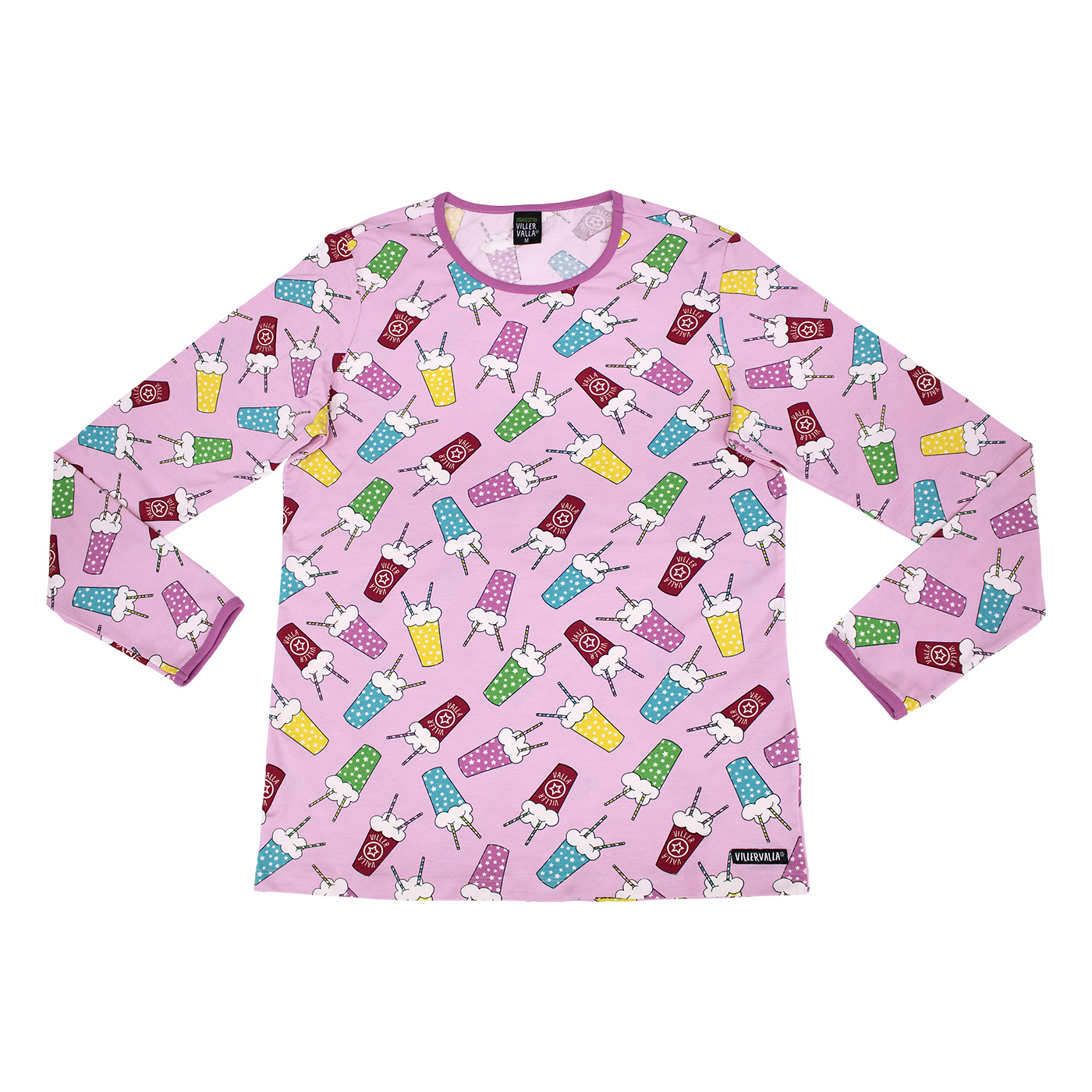 Lovely organic cotton adult long sleeved top in fabulous milkshake print on pink background.