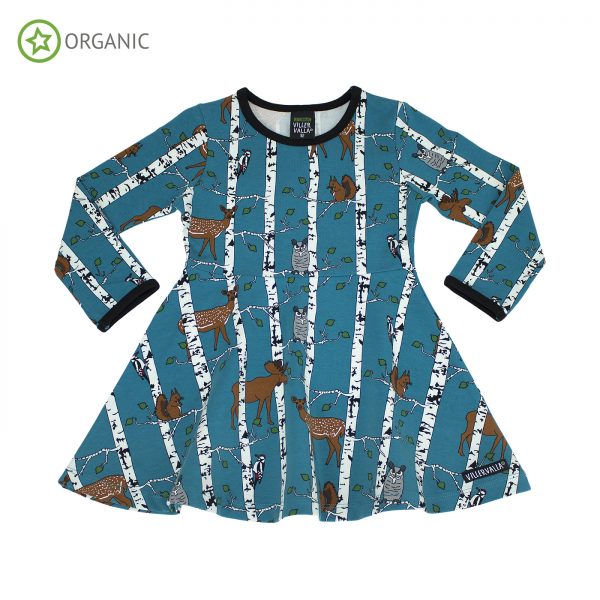 Organic cotton long sleeved dress in beautiful birch animals print on blue background.