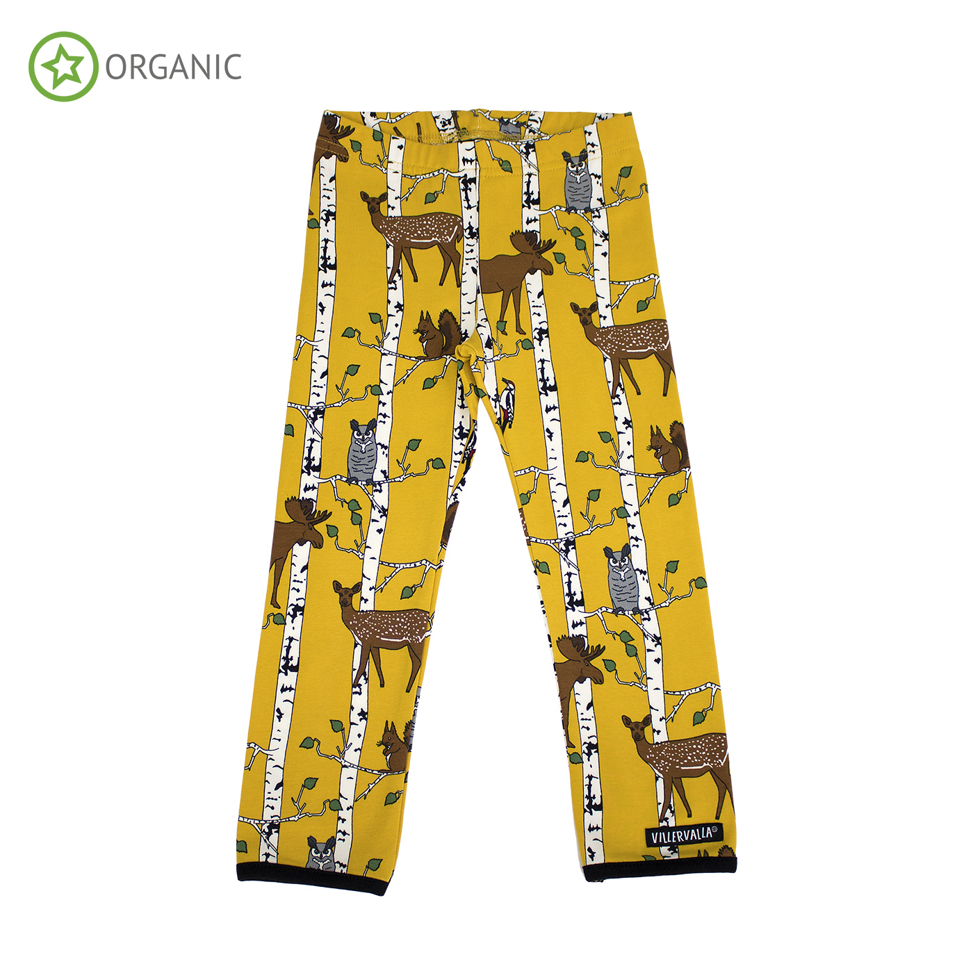 Organic cotton leggings in beautiful birch animals print on mustard background.