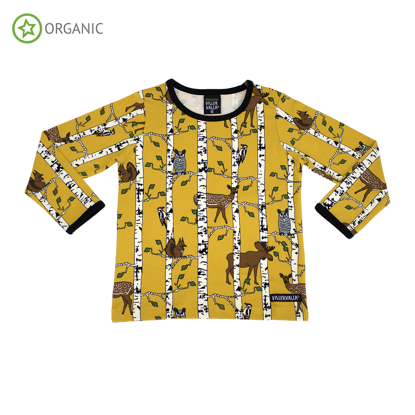Fabulous organic cotton long sleeved tee with beautiful birch animals print on mustard background.