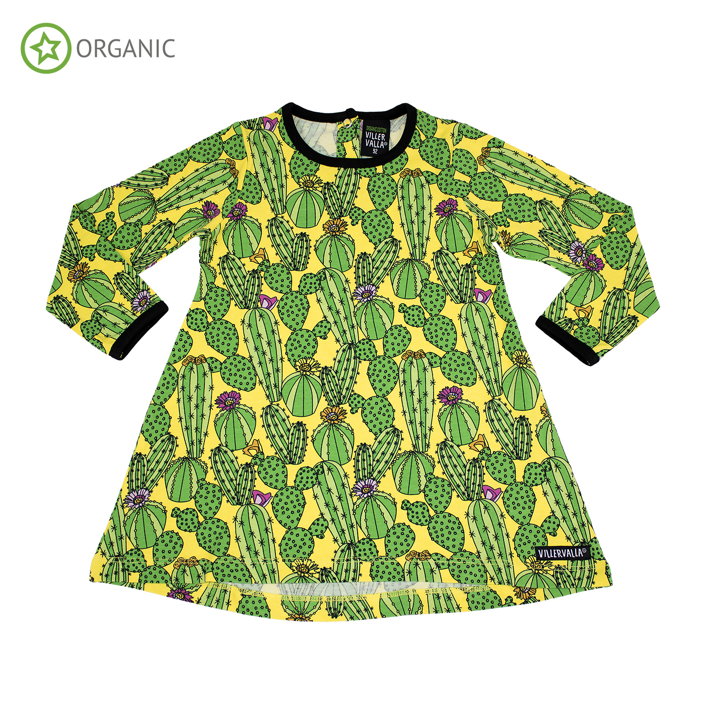 Fabulous organic cotton long sleeved tunic in wonderfully bright cactus print with black trim.