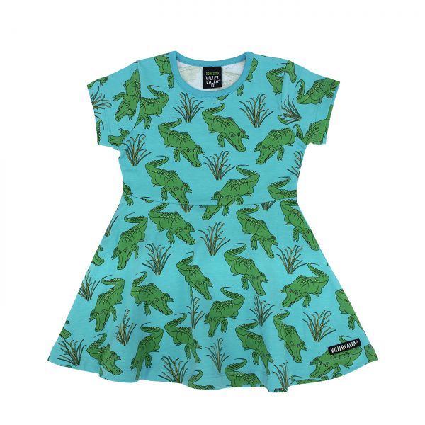 Organic cotton short sleeved twirly dress in fabulous crocodile print on blue background.