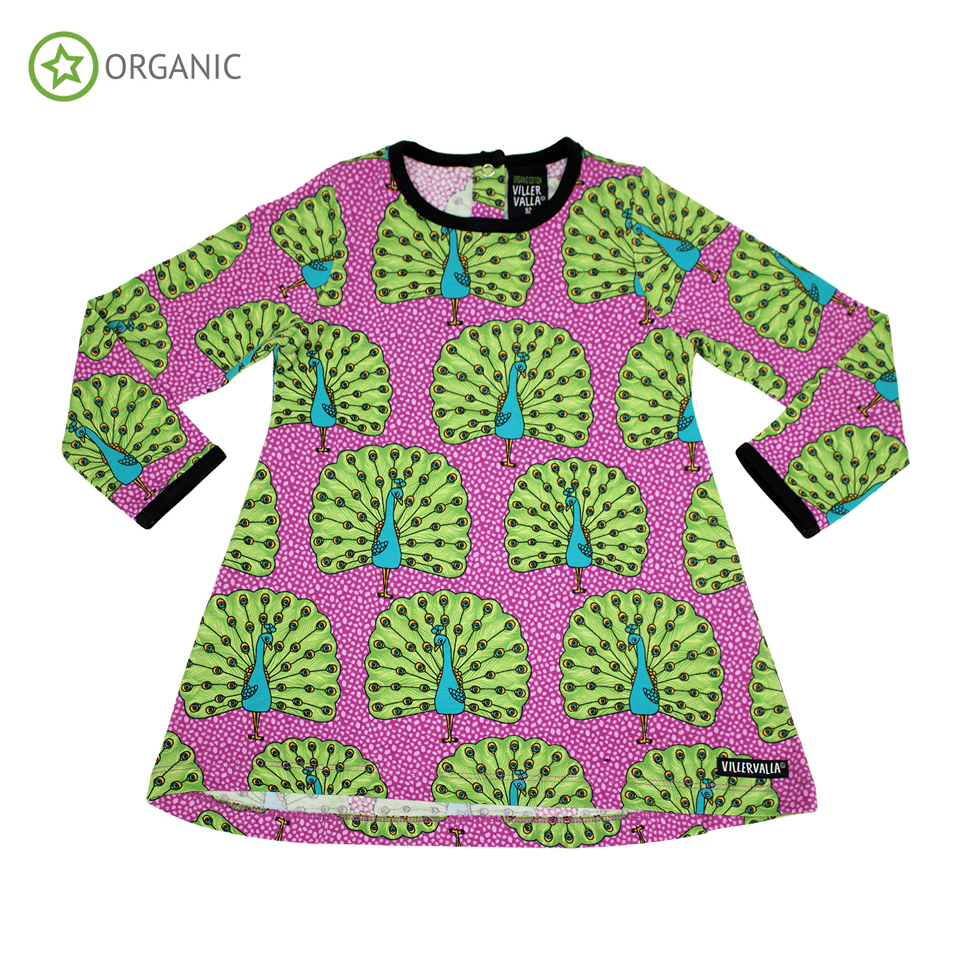 Fabulous organic cotton long sleeved tunic in beautiful peacock print with black trim.