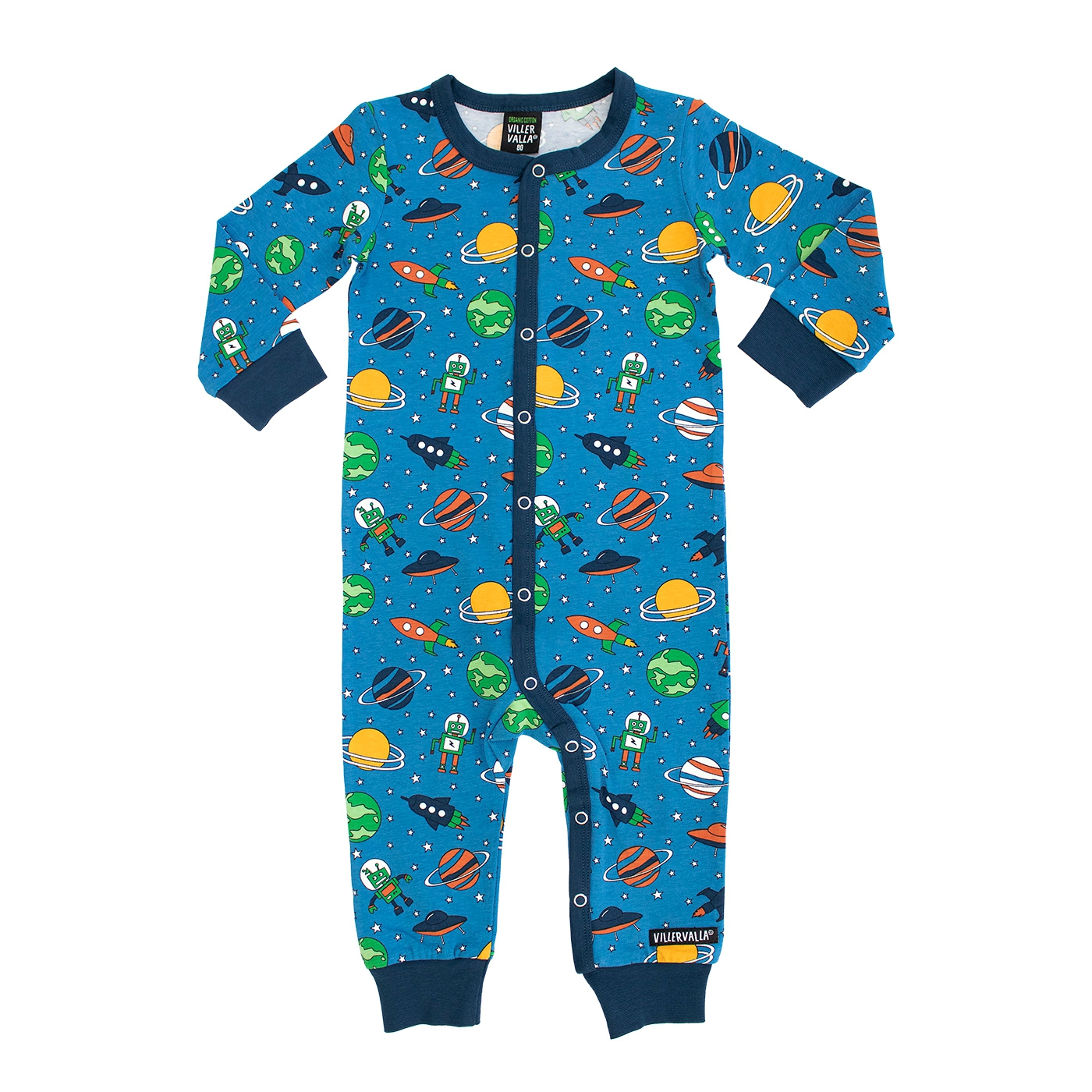 Fabulous soft organic cotton button rompersuit in fab all over space print on marine blue background.